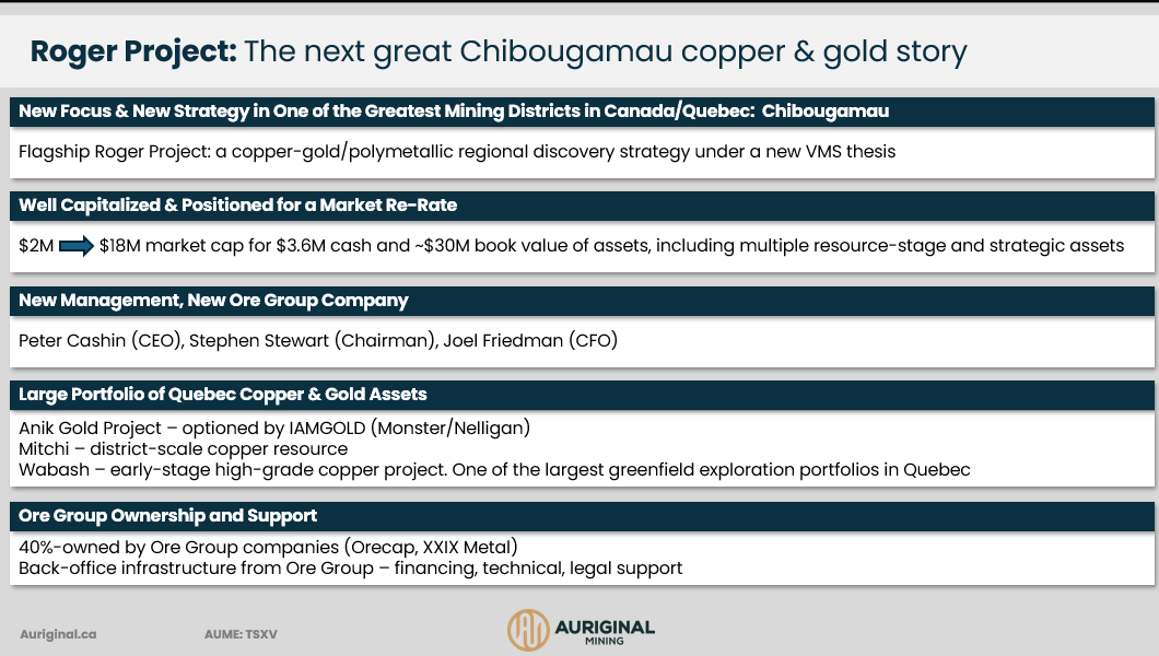 Auriginal Mining is a Quebec-focused copper and gold company with one of the province’s largest and most diversified exploration portfolios. Its 100%-owned flagship Roger Project, located in the Chibougamau district, hosts a known gold-copper deposit with strong potential to host volcanic-hosted polymetallic massive sulphide deposits. With a diversified pipeline of greenfield projects across Quebec’s best-known mining regions and backed by the Ore Group’s proven exploration and capital markets team Auriginal has a clear focus on discovery and growth for copper, zinc and gold. The company is well-positioned to immediately execute an aggressive exploration and acquisition strategy and attract broader market attention.