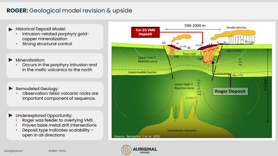 The project is an advanced-stage exploration project and has gone through multiple drill campaigns totaling 58,000 metres. Additionally, underground exploration in 1988 included 1,177 metres of development, 1,433 metres of underground drilling and over 1,000 metres of chip sampling. The Roger deposit is interpreted as a reduced-type intrusion-related porphyry gold-copper deposit that shows strong structural control. Mineralization occurs in the porphyry intrusion and in mafic volcanics to the north. While +500,000 gold equivalent ounces have already been delineated at Roger, the Project continues to provide significant upside given the deposit is open along strike, to the east and west as well as depth.